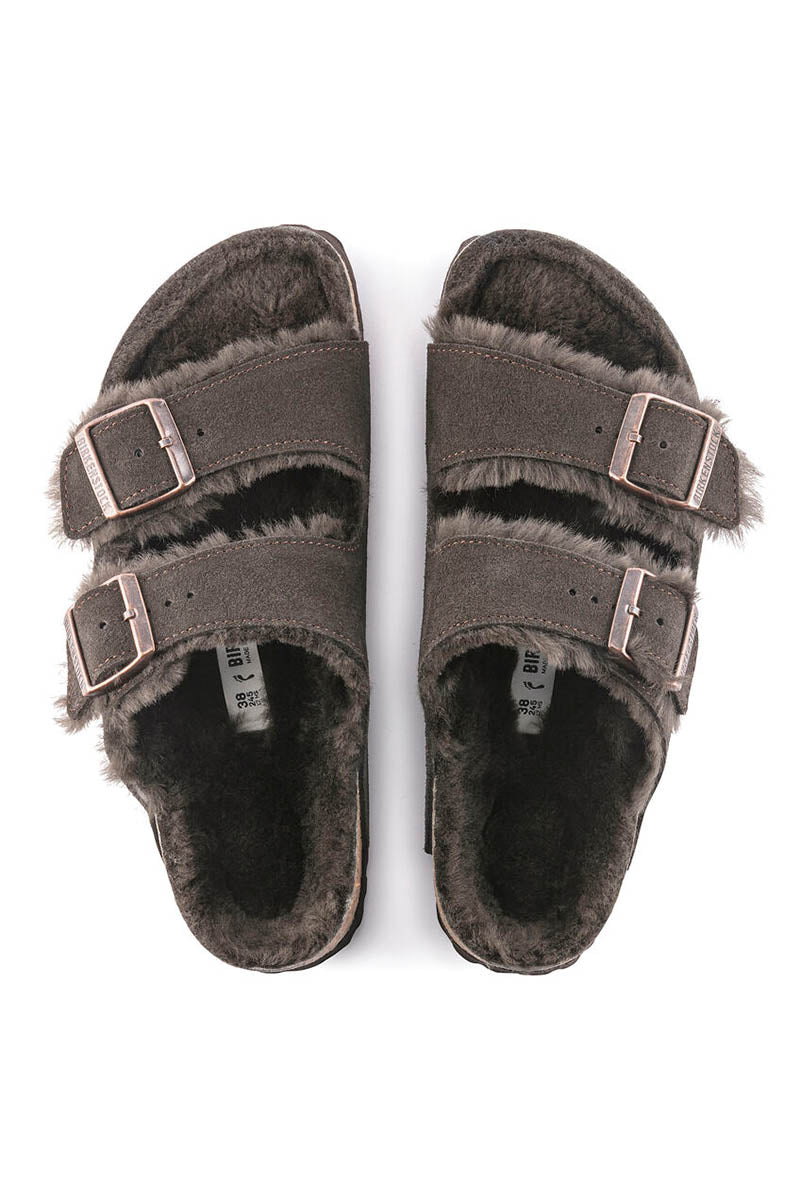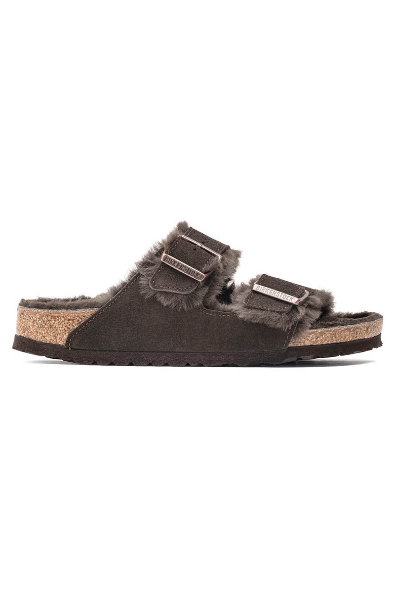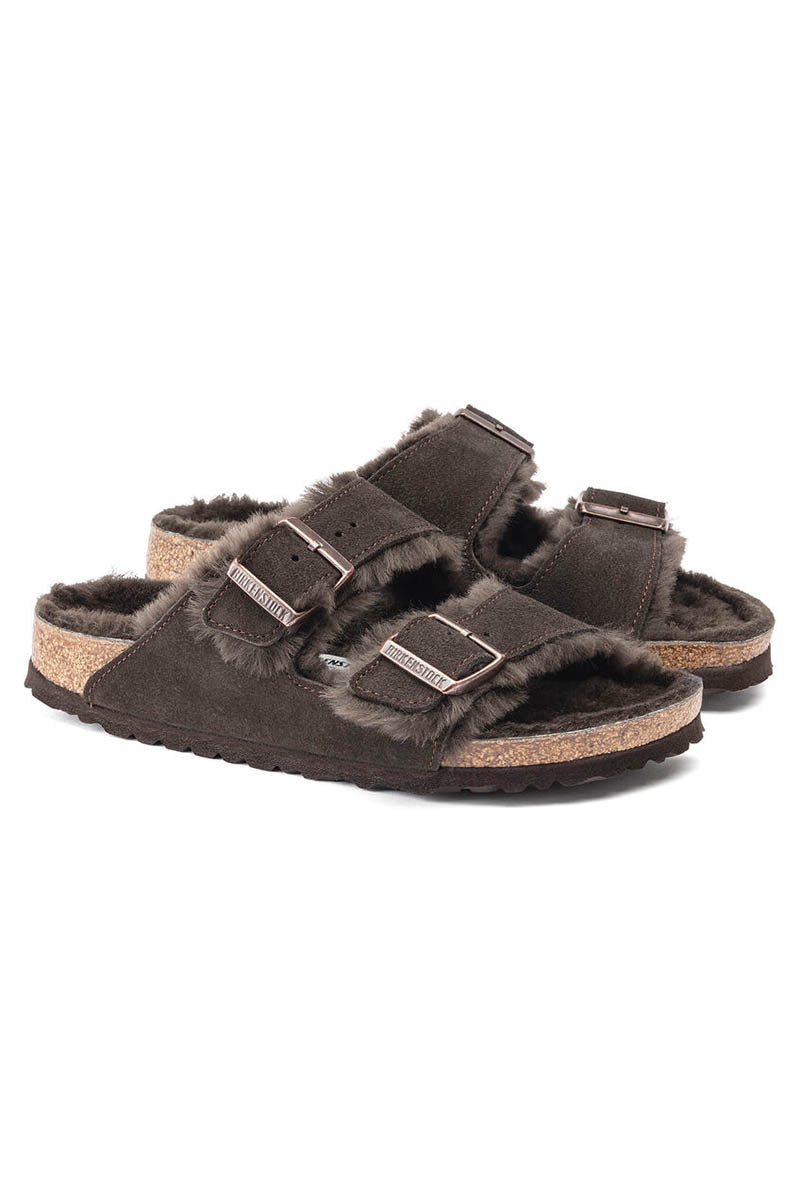 The popular Birkenstock Arizona is a classic model with two adjustable straps. The genuine high-quality mink tan suede uppers feature a cosy soft genuine shearling lining on the anatomically formed cork-latex footbed. These sandals are perfect for chilly, winter evenings.