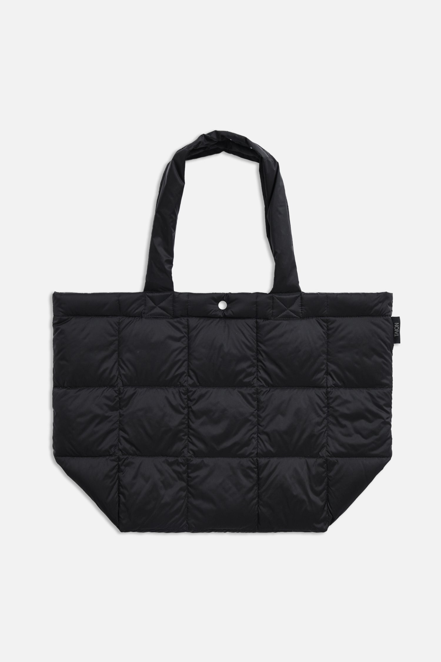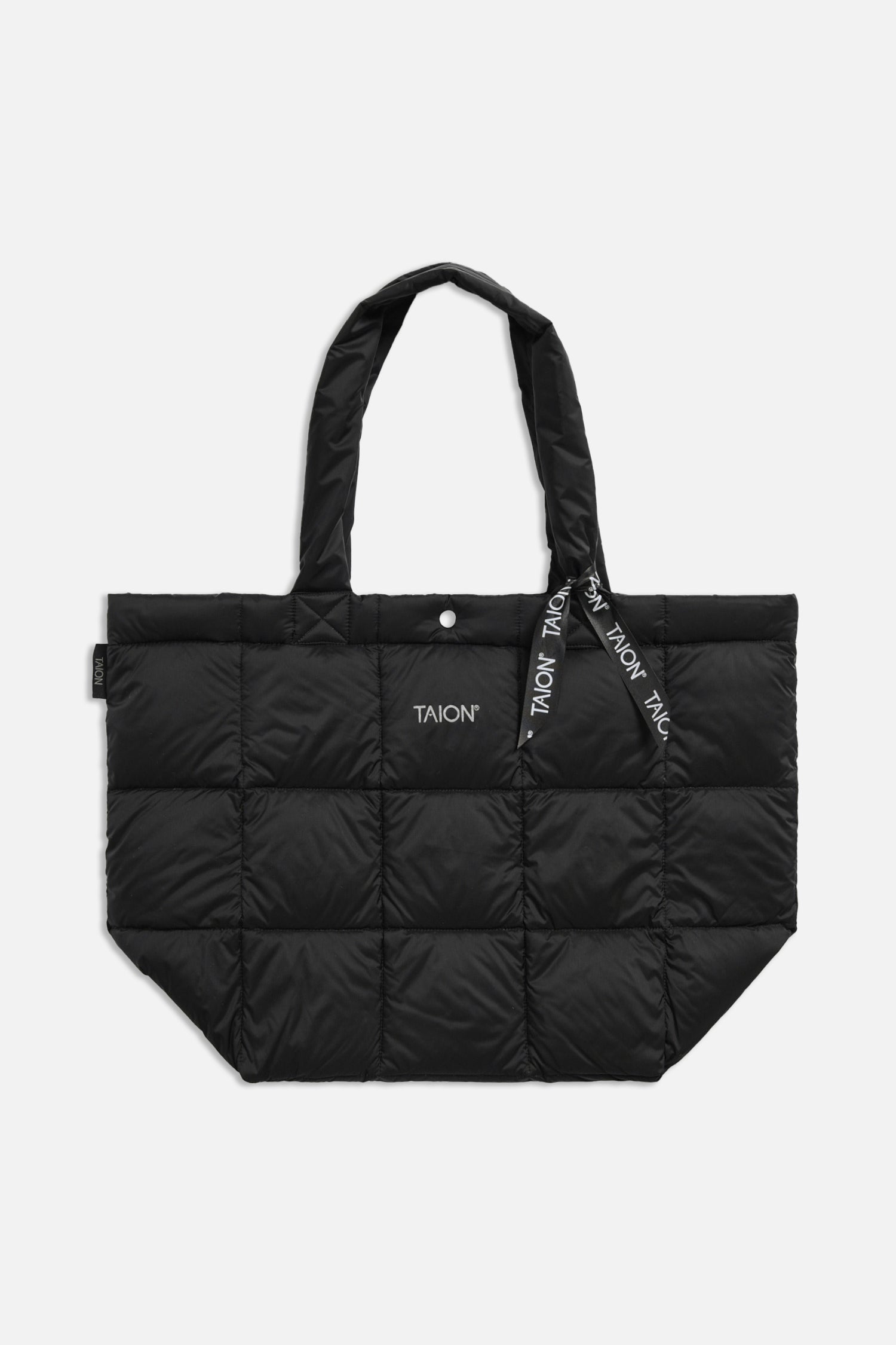 An everyday v-shaped tote bag accented with a small "TAION" logo print on the upper front. The handles are just the right length for carrying by hand, perfect for quick trips or as a lunch bag.