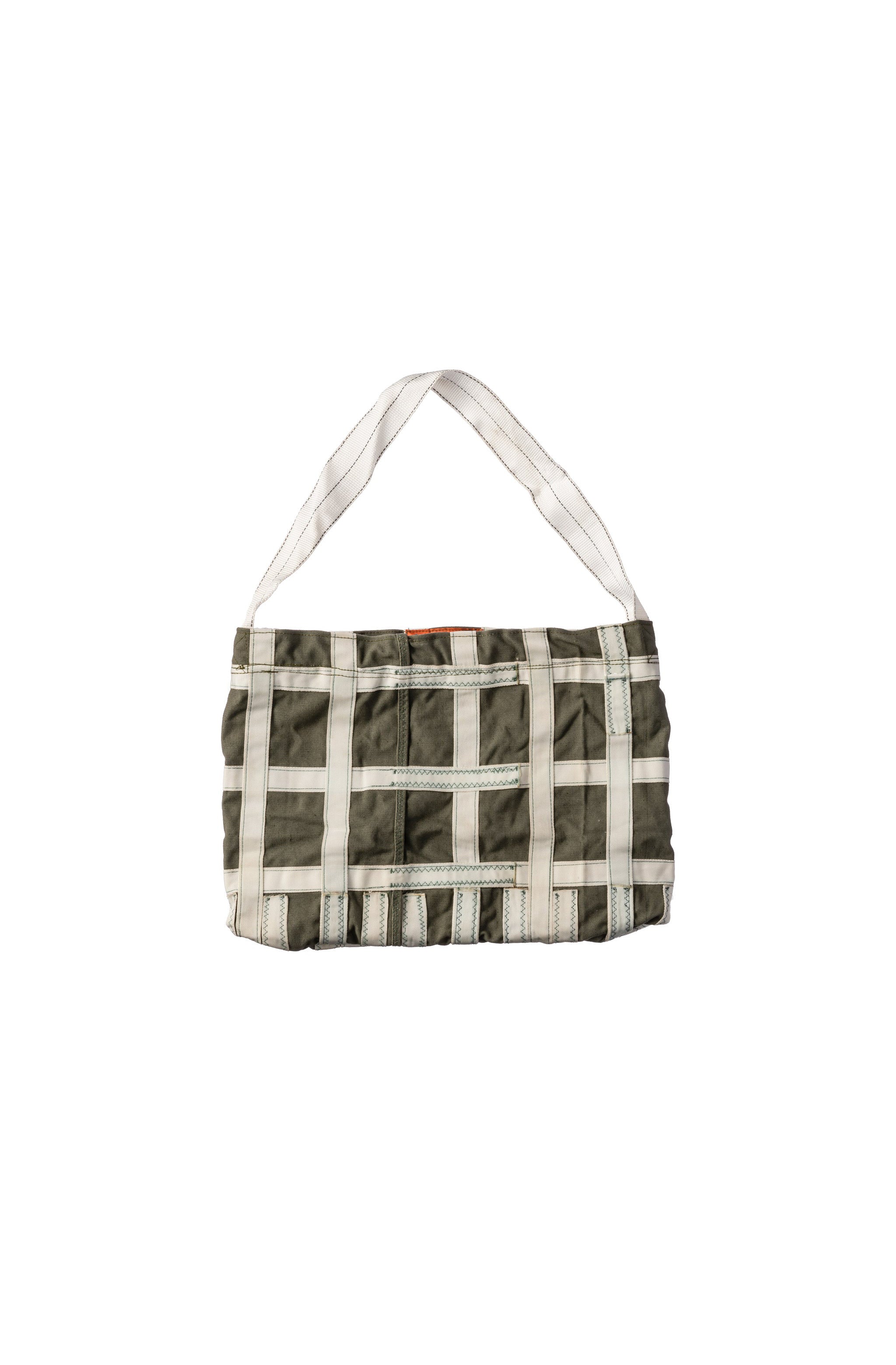 Crafted from repurposed parachute fabric, this one-of-a-kind tote features a zippered closure and reinforced wraparound belt for added durability and security. Rugged yet lightweight, the Vintage Parachute Fabric Bag is built to endure a second lifetime of use, making each piece both functional and full of character.