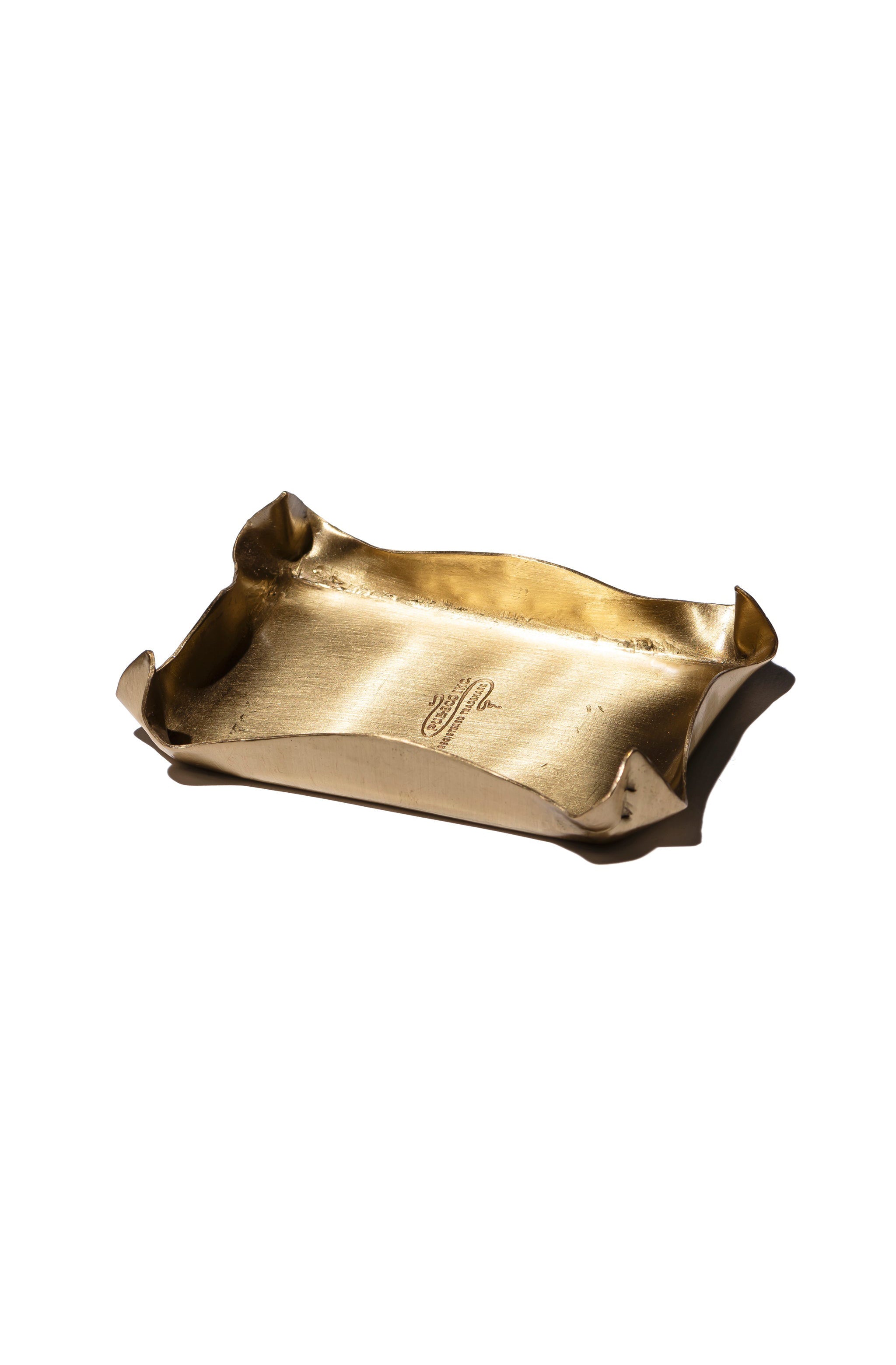 Crafted from solid brass, the Brass Small tray features a raw, hand-formed finish with softly curled edges and a stamped base detail. Its understated design and warm metallic tone make it perfect for holding keys, coins, jewellery, or other daily essentials. Over time, the brass surface will naturally oxidise, developing a rich patina that enhances its character. A simple yet elegant piece for your entryway, bedside, or desk.
