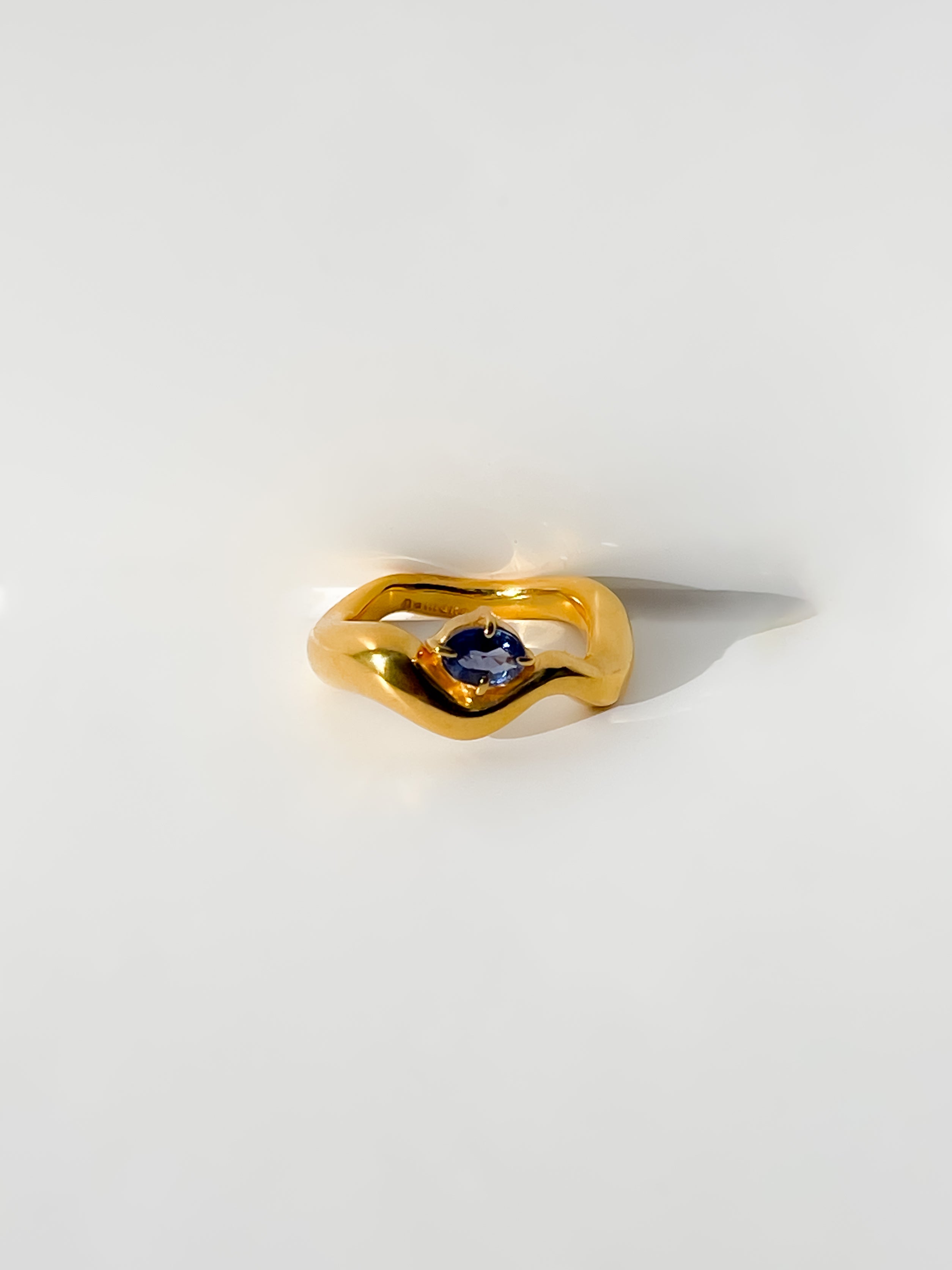 This Wave Ring, in 22K Gold Plated Sterling Silver, complimented by a single large deep blue Sapphire gemstone.