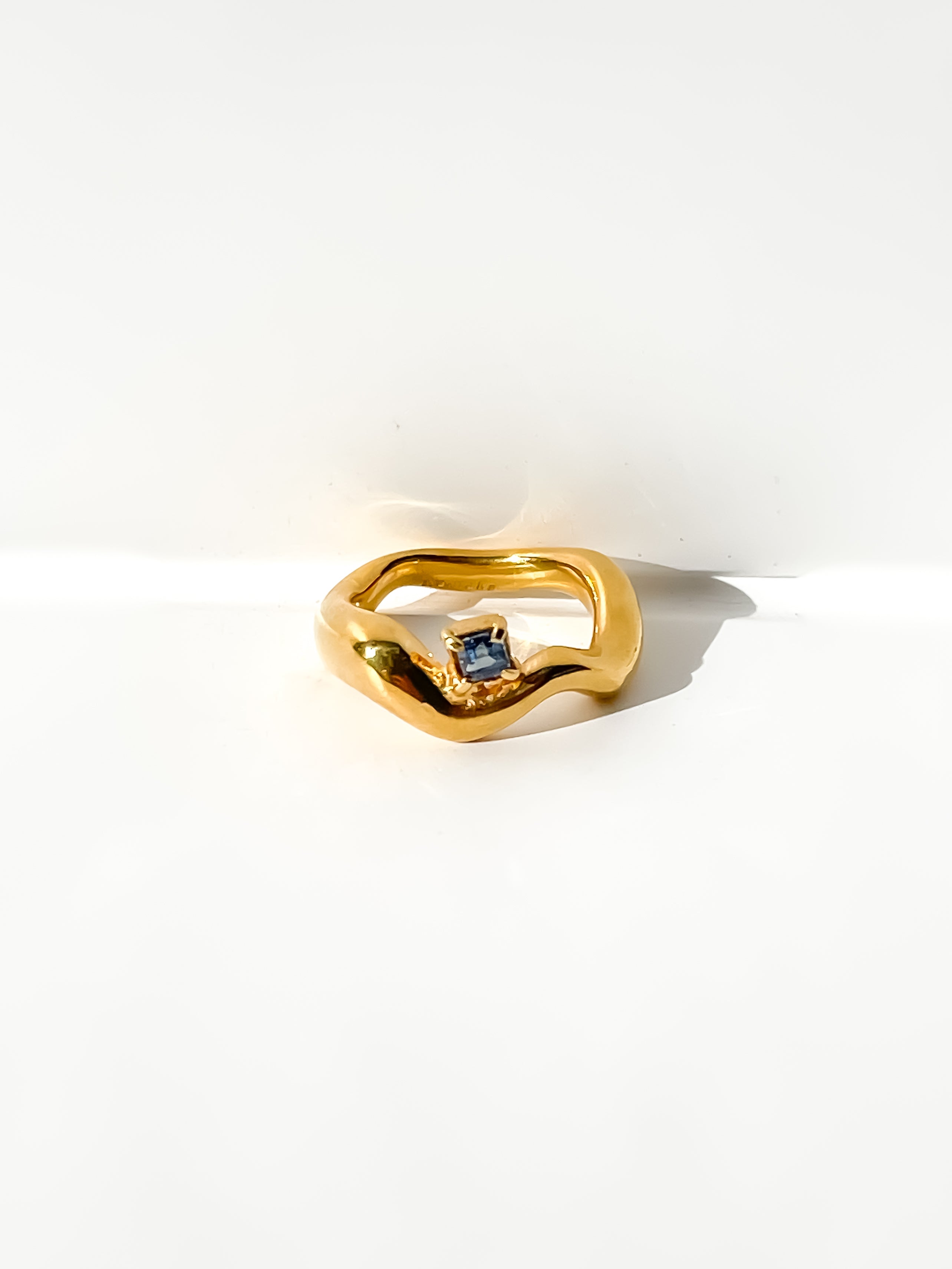 This Wave Ring, in 22K Gold Plated Sterling Silver, complimented by a single Square Blue Sapphire gemstone.