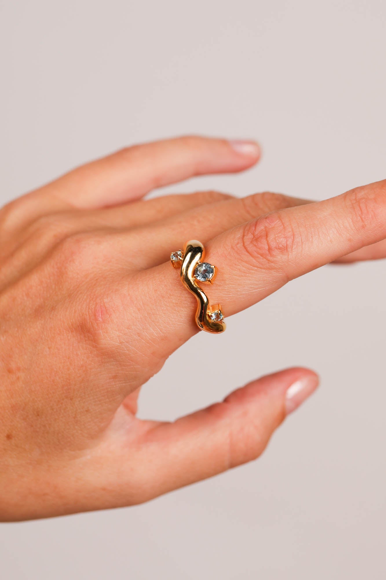 This Wave Ring, in 22K Gold Plated Sterling Silver, with a unique combination of three tonal blue sapphire gemstones, is the perfect addition to any jewellery collection.