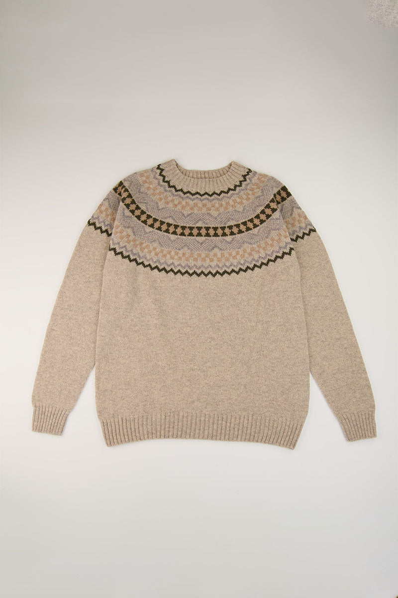 The Soho Jumper features the unmistakable geometric patterns of the Fair Isle jumper have become a symbol of British culture and has long been a favourite of the Royal Family dating back to the 1920s. The Soho is our most technically advanced jumper due to the complex knitting techniques required for the seamless yoke pattern. Knitted and hand linked in the UK with using Australia lamswool from Geelong.