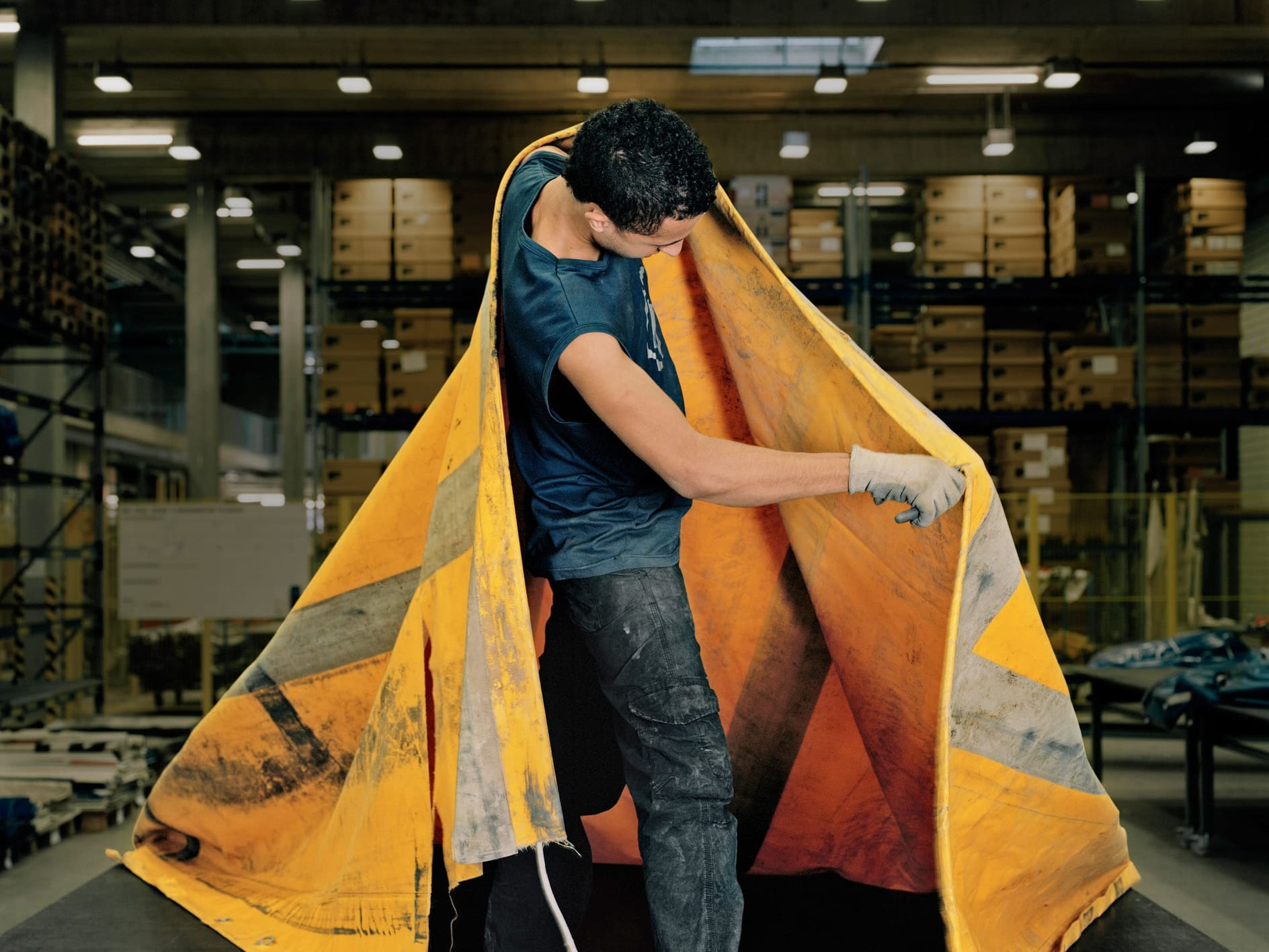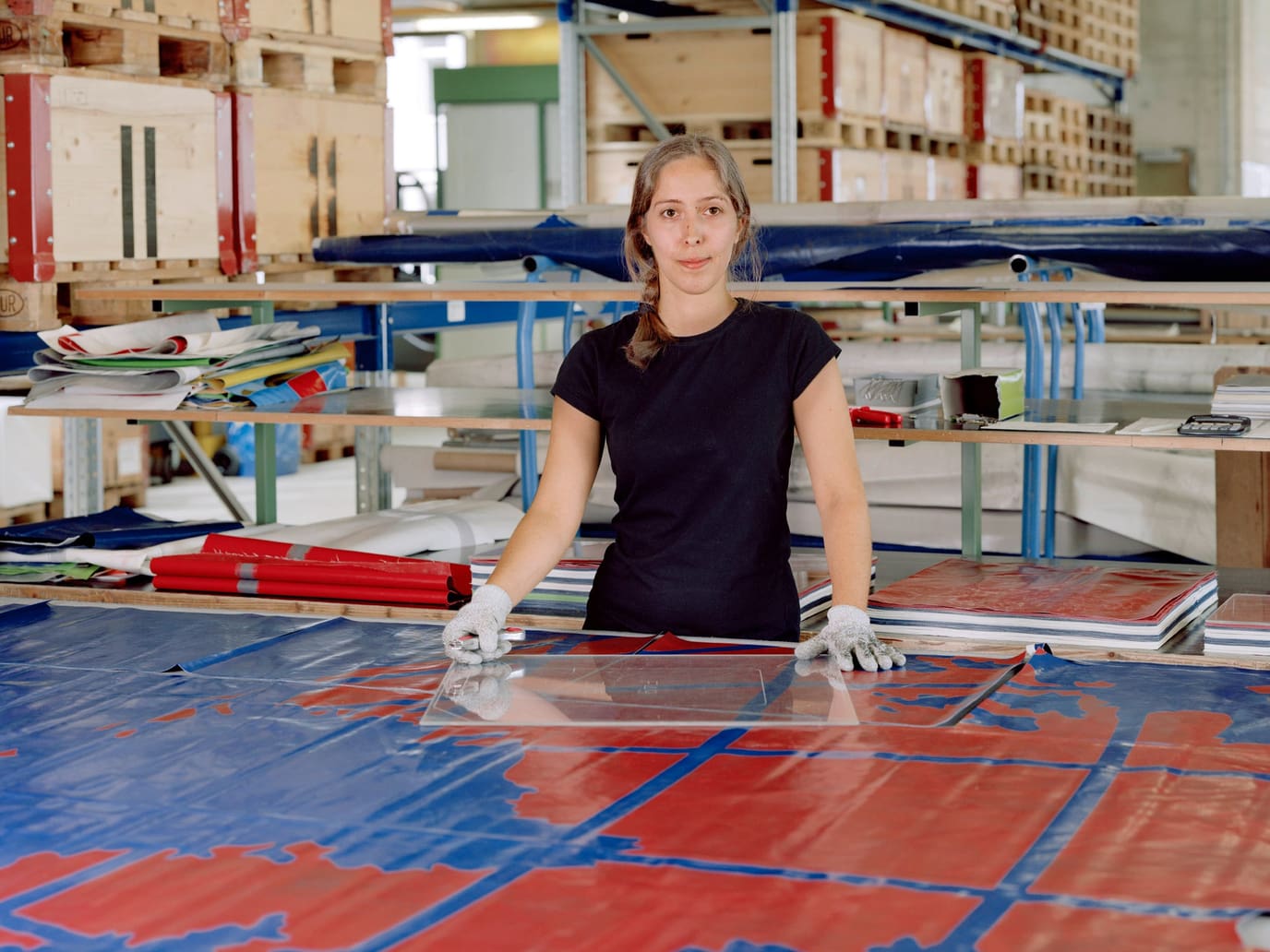 The recycling of used truck tarps into unique, highly functional bags takes place in five highly complex steps at the factory.