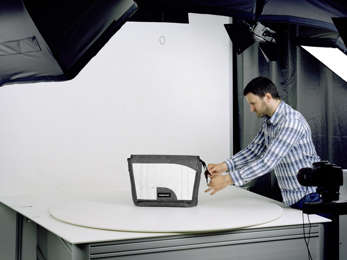 Unique products, which will be sold in the online shop, are put on a pedestal and photographed from all sides.