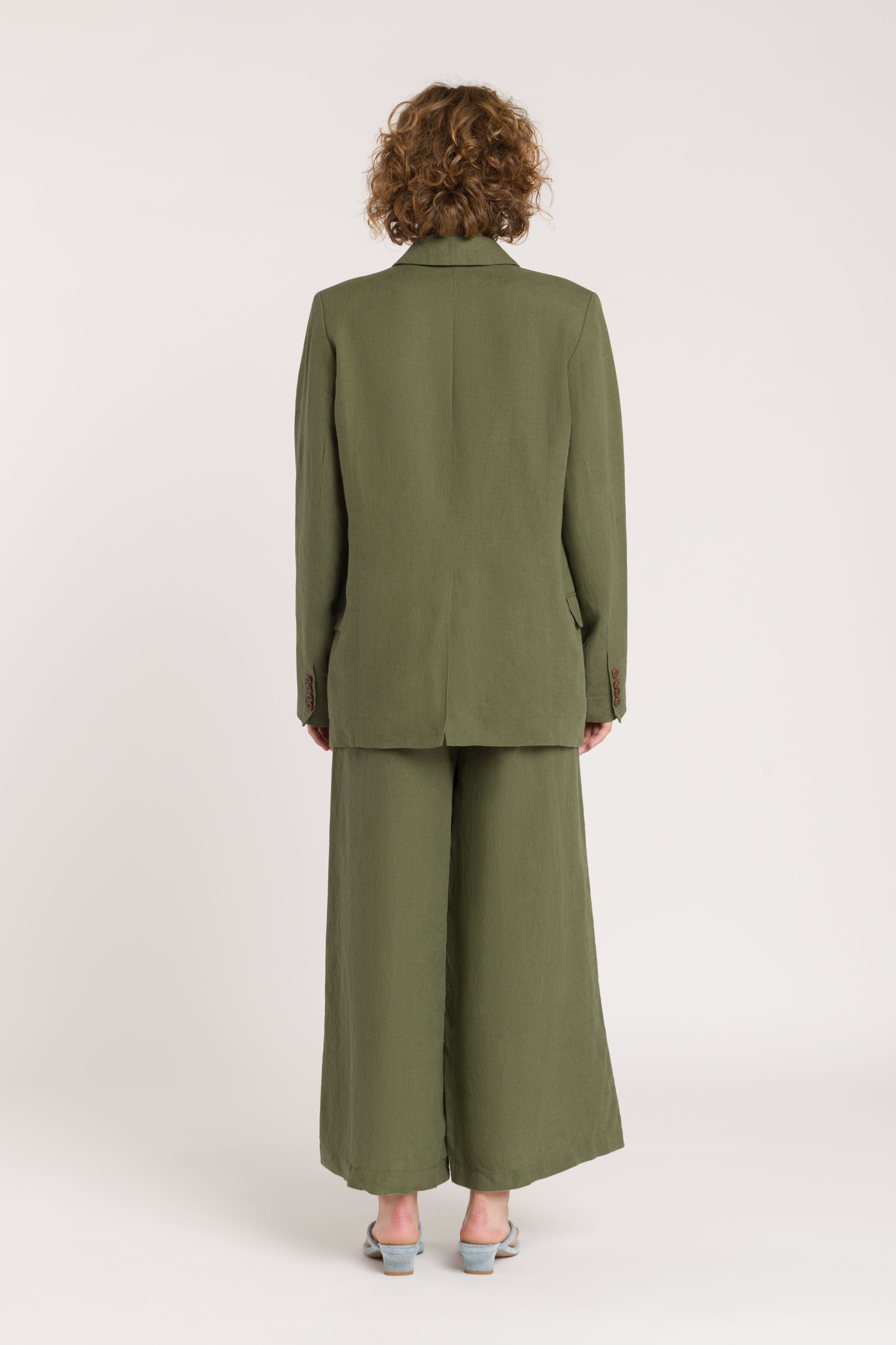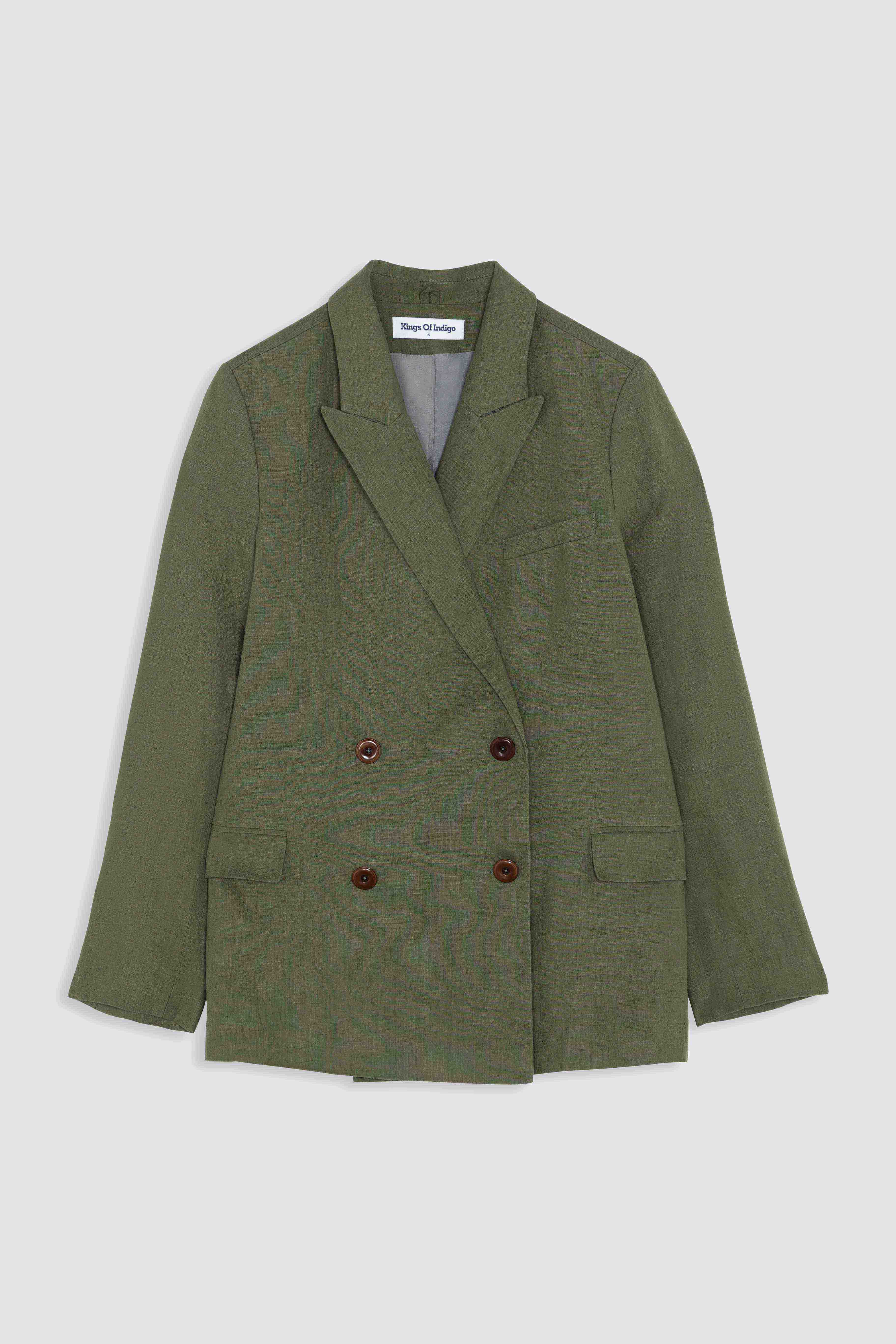 Relaxed fit, fully lined, double breasted blazer with one chest pocket and two lower body pockets. Features a button closure on the sleeves, for an easy roll up