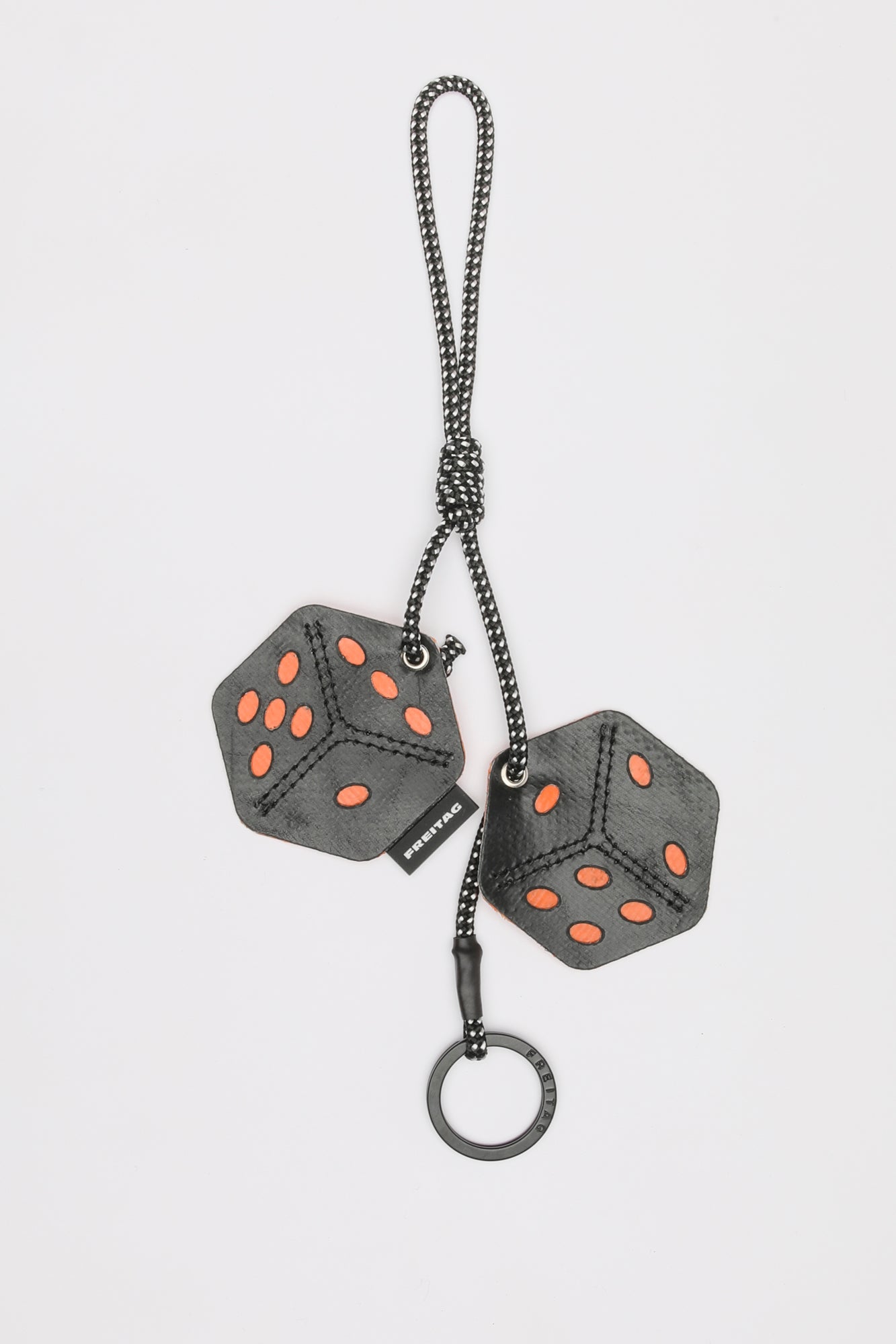 At FREITAG, the iconic ´fuzzy diceª are two-dimensional and made†of used truck tarps, but still just as lucky. Promise