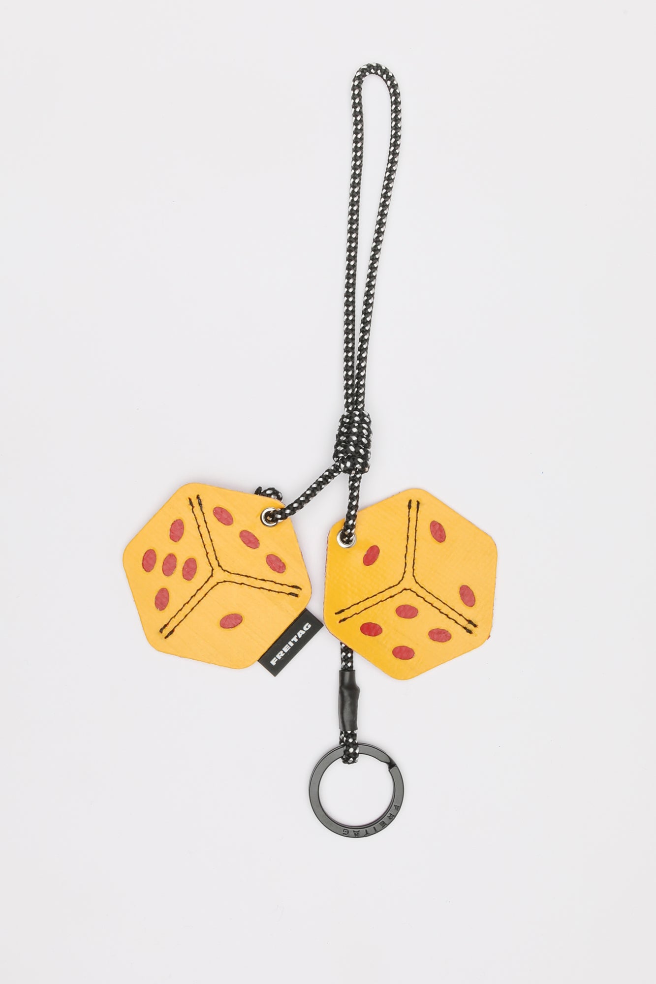 At FREITAG, the iconic ´fuzzy diceª are two-dimensional and made†of used truck tarps, but still just as lucky. Promise