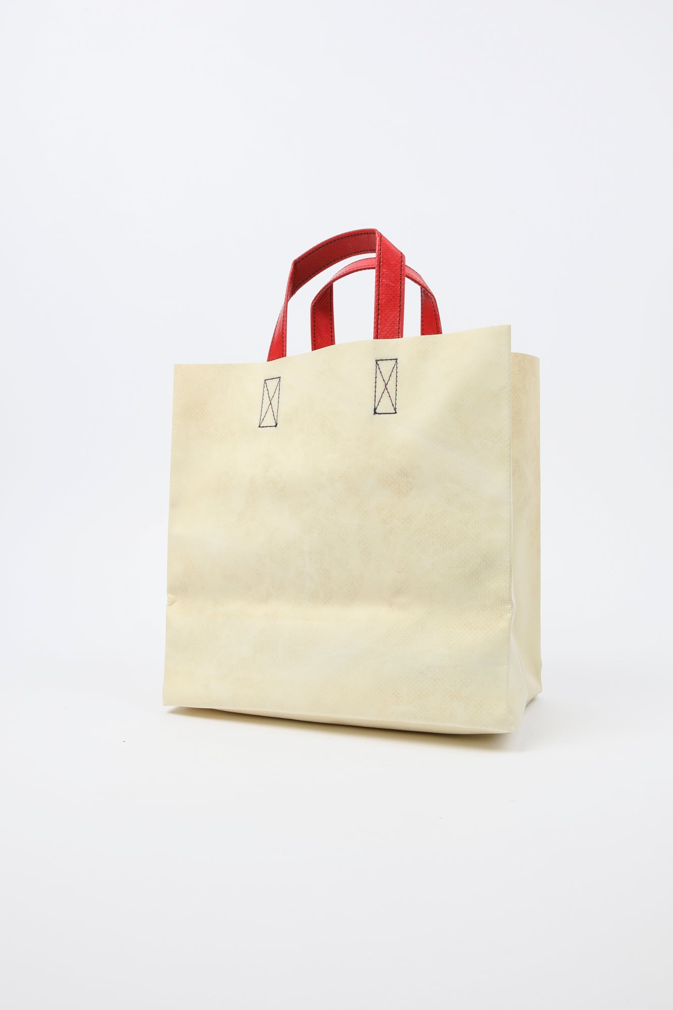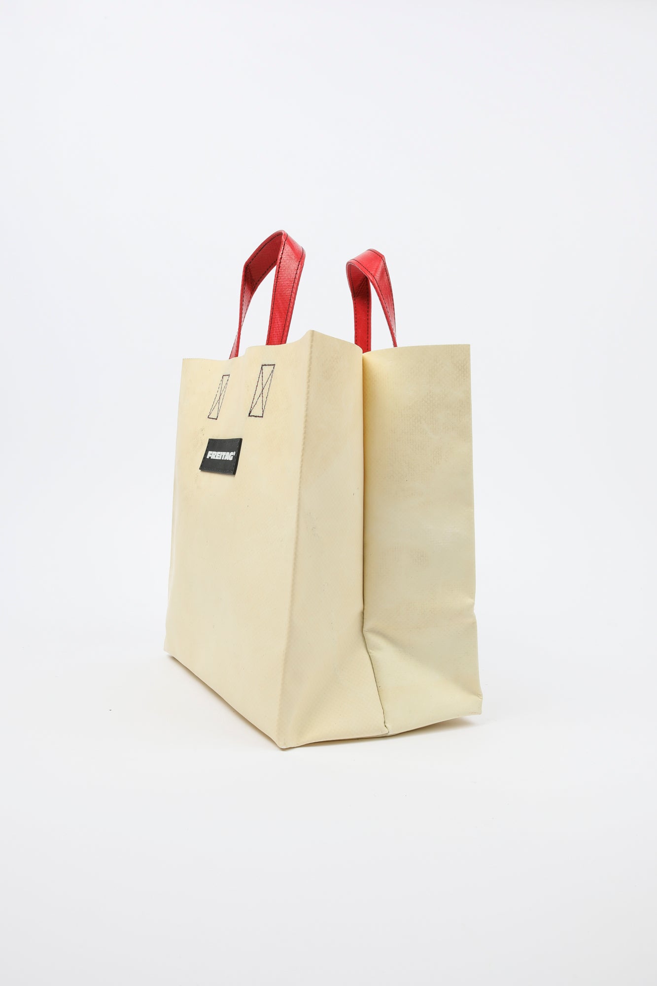 Like its bigger role mode, F52 MIAMI VICE - the truck-tarp version of the universal paper carrier bag - F250 SONNY is also reduced to essentials: two handles, one main compartment, that's it. It's design and shape reflect the original. So, additional handles alternative ways of carrying it and suchlike have been consciously left out. THe F250 SONNY's simple optics are a perfect expression of the owner's individuality because every bag is one-of-a-kind, made from the most beautiful used truck tarps.