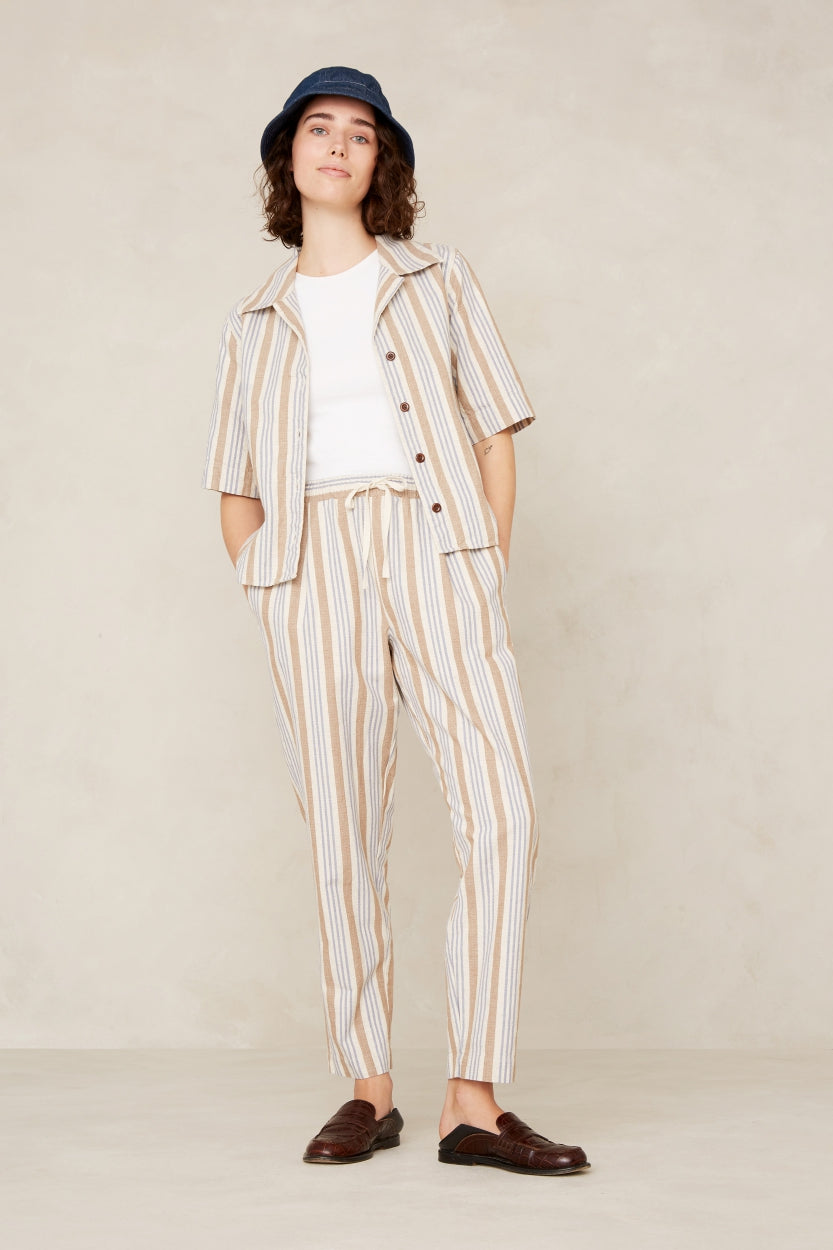 Regular fit pants with elastic waistband for extra comfort. Side seam front pockets and pleats in the front. Welted back pockets with button closure. Features a woven self stripe pattern throughout.